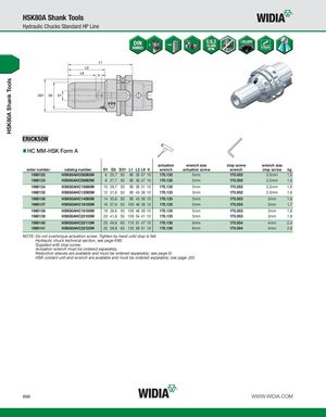 HSK80A Shank Tools HSK80A Shank Tools Hydraulic Chucks Standard HP Line HC MM-HSK Form A actuation wrench size stop screw wrench size order number catalog number D1 D2 D21 L1 L2 L9 V wrench actuation screw wrench stop screw kg 1960122 HSK80AHC06085M 6 25,7 50 85 35 27 10 170.135 5mm 170.002 2,5mm 1,5 1960133 HSK80AHC08085M 8 27,7 50 85 36 27 10 170.135 5mm 170.002 2,5mm 1,5 1960134 HSK80AHC10090M 10 29,7 50 90 38 31 10 170.135 5mm 170.002 2,5mm 1,6 1960135 HSK80AHC12095M 12 31,6 50 95 43 36 10 170.135 5mm 170.002 2,5mm 1,6 1960136 HSK80AHC14095M 14 33,6 50 95 43 36 10 170.135 5mm 170.003 3mm 1,6 1960137 HSK80AHC16100M 16 37,6 50 100 46 39 10 170.135 5mm 170.003 3mm 1,7 1960138 HSK80AHC18100M 18 39,6 50 100 48 39 10 170.135 5mm 170.003 3mm 1,8 1960139 HSK80AHC20105M 20 41,6 50 105 54 41 10 170.135 5mm 170.003 3mm 1,8 1960140 HSK80AHC25115M 25 49,8 63 115 51 47 10 170.136 6mm 170.004 4mm 2,4 1960141 HSK80AHC32125M 32 59,8 63 125 59 51 10 170.136 6mm 170.004 4mm 2,8 NOTE: Do not overtorque actuation screw. Tighten by hand until stop is felt. Hydraulic chuck technical section, see page K60. Supplied with stop screw. Actuation wrench must be ordered separately. Reduction sleeves are available and must be ordered separately; see page I2. HSK coolant unit and wrench are available and must be ordered separately; see page J32. B98 WWW.WIDIA.COM