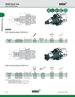 HSK80A Shank Tools HSK80A Shank Tools Combi Shell Mill Adapters CS • Cap Screw Design • HSK Form A lock wrench size combi combi order number catalog number D1 D2 L1 L13 screw lock screw Nm driver ring drive key kg 1839882 HSK80ACS16060M 16 32 60 27 MS1294 6mm 40 CDR16M CDK16M 1,33 1778235 HSK80ACS22060M 22 40 60 31 MS1234 8mm 60 CDR22M CDK22M 1,49 CS • Lock Screw Design • HSK Form A lock combi combi order number catalog number D1 D2 L1 L13 screw wrench driver ring drive key kg 1730386 HSK80ACS27060M 27 48 60 33 KLS27MPKG SMW27M CDR27M CDK27M 1,67 1730387 HSK80ACS32060M 32 58 60 38 KLS32M SMW32M CDR32M CDK32M 1,96 1878181 HSK80ACS40070M 40 70 70 41 KLS40M SMW40M CDR40M CDK40M 2,69 1126837 HSK80ACS50080M 50 90 80 46 KLS50M SMW50M CDR50M CDK50M 4,01 NOTE: Do not overtighten lock screw. Supplied with lock screw, drive ring, and drive keys. Lock screw wrench not included. For HSK coolant unit and wrench, see page J32. B108 WWW.WIDIA.COM