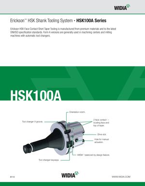 Erickson™ HSK Shank Tooling System • HSK100A Series Erickson HSK Face Contact Short Taper Tooling is manufactured from premium materials and to the latest DIN/ISO specification standards. Form A versions are generally used in machining centers and milling machines with automatic tool changers. HSK100A Orientation notch. 2-face contact — Tool changer V-groove. locating face and top of taper. Drive slot. Hole for manual actuation. WIDIA™ balanced-by-design feature. Tool changer keyways. B110 WWW.WIDIA.COM