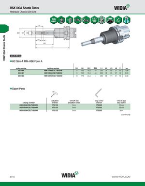 HSK100A Shank Tools HSK100A Shank Tools Hydraulic Chucks Slim Line HC Slim-T MM-HSK Form A order number catalog number D1 D2 D21 D22 L1 L2 L21 L9 V kg 3061086 HSK100AHCSLT06200M 6 13,5 19,5 44 200 35 85 27 10 3,08 3061087 HSK100AHCSLT08200M 8 15,5 19,5 44 200 35 85 27 10 3,09 3061088 HSK100AHCSLT10200M 10 17,5 44,5 — 200 85 171 31 10 3,08 Spare Parts actuation wrench size stop screw wrench size catalog number wrench actuation screw wrench stop screw HSK100AHCSLT06200M 170.135 5mm 170.002 2,5mm HSK100AHCSLT08200M 170.135 5mm 170.002 2,5mm HSK100AHCSLT10200M 170.135 5mm 170.003 3mm (continued) B116 WWW.WIDIA.COM