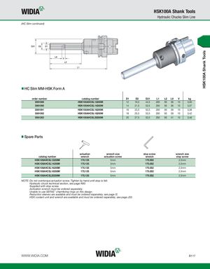 HSK100A Shank Tools HSK100A Shank Tools Hydraulic Chucks Slim Line (HC Slim continued) HC Slim MM-HSK Form A order number catalog number D1 D2 D21 L1 L2 L9 V kg 3061089 HSK100AHCSL12200M 12 19,5 44,5 200 95 36 10 3,00 3061090 HSK100AHCSL14200M 14 21,5 52,5 200 95 36 10 3,37 3061091 HSK100AHCSL16200M 16 23,5 52,5 200 95 39 10 3,38 3061092 HSK100AHCSL18200M 18 25,5 52,5 200 95 39 10 3,42 3061263 HSK100AHCSL20200M 20 27,5 52,5 200 95 41 10 3,46 Spare Parts actuation wrench size stop screw wrench size catalog number wrench actuation screw wrench stop screw HSK100AHCSL12200M 170.135 5mm 170.002 2,5mm HSK100AHCSL14200M 170.135 5mm 170.002 2,5mm HSK100AHCSL16200M 170.135 5mm 170.002 2,5mm HSK100AHCSL18200M 170.135 5mm 170.002 2,5mm HSK100AHCSL20200M 170.135 5mm 170.002 2,5mm NOTE: Do not overtorque actuation screw. Tighten by hand until stop is felt. Hydraulic chuck technical section, see page K60. Supplied with stop screw. Activation wrench must be ordered separately. Unable to use SEFAS™ chamfering rings on this design. Reduction sleeves are available and must be ordered separately; see page I2. HSK coolant unit and wrench are available and must be ordered separately; see page J32. WWW.WIDIA.COM B117