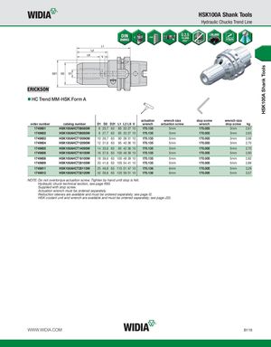 HSK100A Shank Tools HSK100A Shank Tools Hydraulic Chucks Trend Line HC Trend MM-HSK Form A actuation wrench size stop screw wrench size order number catalog number D1 D2 D21 L1 L2 L9 V wrench actuation screw wrench stop screw kg 1749601 HSK100AHCT06085M 6 25,7 63 85 33 27 10 170.135 5mm 170.003 3mm 2,61 1749602 HSK100AHCT08085M 8 27,7 63 85 33 27 10 170.135 5mm 170.003 3mm 2,63 1749603 HSK100AHCT10090M 10 29,7 63 90 38 31 10 170.135 5mm 170.003 3mm 2,66 1749604 HSK100AHCT12095M 12 31,6 63 95 40 36 10 170.135 5mm 170.003 3mm 2,70 1749605 HSK100AHCT14095M 14 33,6 63 95 42 36 10 170.135 5mm 170.005 5mm 2,70 1749606 HSK100AHCT16100M 16 37,6 63 100 48 39 10 170.135 5mm 170.005 5mm 2,80 1749608 HSK100AHCT18100M 18 39,6 63 100 48 39 10 170.135 5mm 170.005 5mm 2,82 1749609 HSK100AHCT20105M 20 41,6 63 105 54 41 10 170.135 5mm 170.005 5mm 2,89 1749611 HSK100AHCT25115M 25 49,8 63 115 51 47 10 170.136 6mm 170.005 5mm 3,29 1749612 HSK100AHCT32120M 32 59,8 63 120 59 51 10 170.136 6mm 170.005 5mm 3,57 NOTE: Do not overtorque actuation screw. Tighten by hand until stop is felt. Hydraulic chuck technical section, see page K60. Supplied with stop screw. Actuation wrench must be ordered separately. Reduction sleeves are available and must be ordered separately; see page I2. HSK coolant unit and wrench are available and must be ordered separately; see page J32. WWW.WIDIA.COM B119
