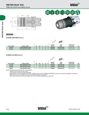 HSK100A Shank Tools HSK100A Shank Tools HPMC High-Performance Milling Chucks HPMC MM-HSK Form A locknut stop wrench size order number catalog number D1 D11 L1 L9 V wrench screw stop screw kg 3100542 HSK100AHPMC20115M 20 53 115 54 10 PSW52M MCSS16018M 2,5mm & 5mm 3,13 3100543 HSK100AHPMC32135M 32 70 135 68 10 PSW68M MCSS16018M 2,5mm & 5mm 4,13 HPMC IN-HSK Form A locknut stop wrench size order number catalog number D1 D11 L1 L9 V wrench screw stop screw lbs 3100539 HSK100AHPMC075453 3/4 2.09 4.53 2.05 .4 PSW52M MCSS16018M 2,5mm & 5mm 7.00 3100540 HSK100AHPMC100512 1 2.40 5.12 2.56 .4 PSW58M MCSS16018M 2,5mm & 5mm 8.45 3100541 HSK100AHPMC125531 1 1/4 2.76 5.32 2.68 .4 PSW68M MCSS16018M 2,5mm & 5mm 9.05 NOTE: Milling chuck technical section, see page K64. Supplied with locknut and stop screw. Locknut wrench must be ordered separately. Optional M6~1,0P fine-balancing screw set is available (order number HPMCBALSCREWSET) and must be ordered separately; see page J4. Reduction sleeves are available and must be ordered separately; see page I6. HSK coolant unit and wrench are available and must be ordered separately; see page J32. B120 WWW.WIDIA.COM