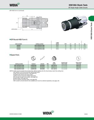 HSK100A Shank Tools HSK100A Shank Tools ER Single-Angle Collet Chucks (ER-HSK Form A continued) collet series ER Round-HSK Form A collet order number catalog number series D11 L1 L9 V kg 1086563 HSK100AER25100M ER25 42 100 40 5 2,51 1086584 HSK100AER32100M ER32 50 100 45 4 2,70 1086585 HSK100AER40120M ER40 63 120 52 8 3,51 Spare Parts stop wrench size stop screw catalog number locknut wrench Nm screw stop screw cone cap HSK100AER25100M LNSER25M ER25WM 104 SS075041G 4mm & 5/32 SSCC075 HSK100AER32100M LNSER32M ER32WM 136 SS094041G 4mm & 5/32 SSCC094 HSK100AER40120M LNSER40M ER40WM 176 SS112041G 4mm & 5/32 SSCC112 NOTE: Collet must be loaded into locknut first. Before loading into the chuck body, insert the cutting tool, then tighten to the recommended tightening torque. Collet chuck technical section, see page K74. Supplied with locknut and stop screw. Locknut wrench must be ordered separately. ER standard straight-bore collets, see page I50. ER tap collets, see page I58. ER TCT tension-only tap collets, see page I60. HSK coolant unit and wrench are available and must be ordered separately; see page J32. WWW.WIDIA.COM B123