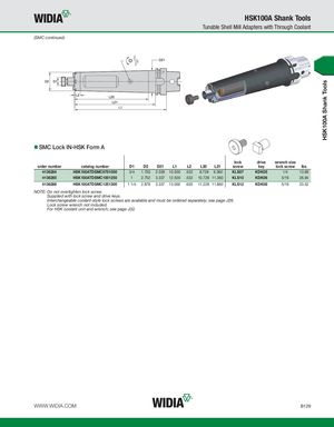 HSK100A Shank Tools HSK100A Shank Tools Tunable Shell Mill Adapters with Through Coolant (SMC continued) SMC Lock IN-HSK Form A lock drive wrench size order number catalog number D1 D2 D21 L1 L2 L20 L21 screw key lock screw lbs 4136284 HSK100ATDSMC0751050 3/4 1.750 2.559 10.500 .532 8.728 9.360 KLS07 KDK05 1/4 13.69 4136285 HSK100ATDSMC1001250 1 2.752 3.337 12.500 .532 10.728 11.360 KLS10 KDK06 5/16 26.94 4136286 HSK100ATDSMC1251300 1 1/4 2.878 3.337 13.000 .630 11.228 11.860 KLS12 KDK08 5/16 33.52 NOTE: Do not overtighten lock screw. Supplied with lock screw and drive keys. Interchangeable coolant-style lock screws are available and must be ordered separately; see page J26. Lock screw wrench not included. For HSK coolant unit and wrench; see page J32. WWW.WIDIA.COM B129