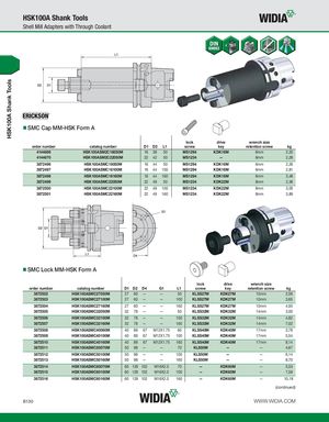 HSK100A Shank Tools HSK100A Shank Tools Shell Mill Adapters with Through Coolant SMC Cap MM-HSK Form A lock drive wrench size order number catalog number D1 D2 L1 screw key retention screw kg 4144669 HSK100ASM2C16050M 16 38 50 MS1294 KDK16M 6mm 2,20 4144670 HSK100ASM2C22050M 22 42 50 MS1234 — 8mm 2,28 3872496 HSK100ASMC16050M 16 44 50 MS1294 KDK16M 6mm 2,26 3872497 HSK100ASMC16100M 16 44 100 MS1294 KDK16M 6mm 2,81 3872498 HSK100ASMC16160M 16 44 160 MS1294 KDK16M 6mm 3,48 3872499 HSK100ASMC22050M 22 49 50 MS1234 KDK22M 8mm 2,36 3872500 HSK100ASMC22100M 22 49 100 MS1234 KDK22M 8mm 3,05 3872501 HSK100ASMC22160M 22 49 160 MS1234 KDK22M 8mm 3,89 SMC Lock MM-HSK Form A lock drive wrench size order number catalog number D1 D2 D4 G1 L1 screw key retention screw kg 3872502 HSK100ASMC27050M 27 60 — — 50 KLSS27M KDK27M 10mm 2,59 3872503 HSK100ASMC27100M 27 60 — — 100 KLSS27M KDK27M 10mm 3,65 3872504 HSK100ASMC27160M 27 60 — — 160 KLSS27M KDK27M 10mm 4,93 3872505 HSK100ASMC32050M 32 78 — — 50 KLSS32M KDK32M 14mm 3,00 3872506 HSK100ASMC32100M 32 78 — — 100 KLSS32M KDK32M 14mm 4,82 3872507 HSK100ASMC32160M 32 78 — — 160 KLSS32M KDK32M 14mm 7,02 3872508 HSK100ASMC40060M 40 89 67 M12X1.75 60 KLSS40M KDK40M 17mm 3,78 3872509 HSK100ASMC40100M 40 89 67 M12X1.75 100 KLSS40M KDK40M 17mm 5,54 3872510 HSK100ASMC40160M 40 89 67 M12X1.75 160 KLSS40M KDK40M 17mm 8,14 3872511 HSK100ASMC50070M 50 98 — — 70 KLS50M — — 4,67 3872512 HSK100ASMC50100M 50 98 — — 100 KLS50M — — 6,14 3872513 HSK100ASMC50160M 50 98 — — 160 KLS50M — — 8,70 3872514 HSK100ASMC60070M 60 129 102 M16X2.0 70 — KDK60M — 5,53 3872515 HSK100ASMC60100M 60 129 102 M16X2.0 100 — KDK60M — 7,58 3872516 HSK100ASMC60160M 60 129 102 M16X2.0 160 — KDK60M — 10,18 (continued) B130 WWW.WIDIA.COM