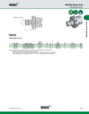 HSK100A Shank Tools HSK100A Shank Tools HSK Modular Adapters CSWS system size RFX-HSK Form A CSWS lock order number catalog number system size D2 L1 screw Nm wrench kg 3881208 HSK100ARFX420080M RFX420 42 80 RFX420LS 20 12148041300 1,00 3881209 HSK100ARFX550090M RFX550 55 90 RFX550LS 25 12148041400 2,20 3881210 HSK100ARFX720105M RFX720 72 105 RFX720LS 25 12148041400 2,50 NOTE: Do not overtorque actuation screw; use recommended torques referenced above. Supplied with actuation mechanism and sealing ring. HSK coolant unit and wrench are available and must be ordered separately; see page J32. With HSK adapters to DIN 69893-1 Form A or Form C, coolant pipe must be removed. WWW.WIDIA.COM B135