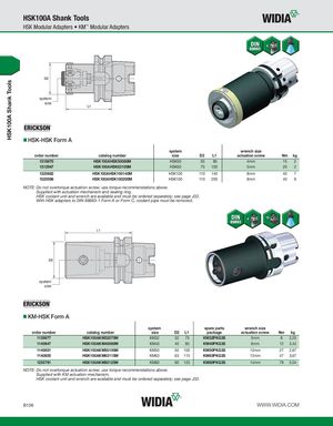 HSK100A Shank Tools HSK100A Shank Tools HSK Modular Adapters • KM™ Modular Adapters system size HSK-HSK Form A system wrench size order number catalog number size D2 L1 actuation screw Nm kg 1318870 HSK100AHSK50080M HSK50 55 80 4mm 15 2 1312947 HSK100AHSK63100M HSK63 70 100 5mm 20 2 1320682 HSK100AHSK100140M HSK100 110 140 8mm 40 7 1520596 HSK100AHSK100200M HSK100 110 200 8mm 40 9 NOTE: Do not overtorque actuation screw; use torque recommendations above. Supplied with actuation mechanism and sealing ring. HSK coolant unit and wrench are available and must be ordered separately; see page J32. With HSK adapters to DIN 69893-1 Form A or Form C, coolant pipe must be removed. L1 system size KM-HSK Form A system spare parts wrench size order number catalog number size D2 L1 package actuation screw Nm kg 1139877 HSK100AKM32075M KM32 32 75 KM32PKG3S 5mm 8 2,25 1140647 HSK100AKM40080M KM40 40 80 KM40PKG3S 6mm 12 2,42 1140651 HSK100AKM50100M KM50 50 100 KM50PKG3S 10mm 27 2,87 1140655 HSK100AKM63115M KM63 63 115 KM63PKG3S 12mm 47 3,67 1255791 HSK100AKM80125M KM80 80 125 KM80PKG3S 14mm 79 5,04 NOTE: Do not overtorque actuation screw; use torque recommendations above. Supplied with KM actuation mechanism. HSK coolant unit and wrench are available and must be ordered separately; see page J32. B136 WWW.WIDIA.COM