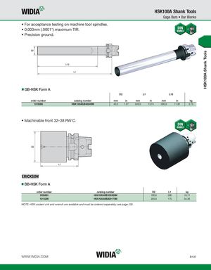 HSK100A Shank Tools HSK100A Shank Tools Gage Bars • Bar Blanks • For acceptance testing on machine tool spindles. • 0,003mm (.0001") maximum TIR. • Precision ground. GB-HSK Form A D2 L1 L13 order number catalog number mm in mm in mm in kg 1316356 HSK100AGB40349M 40,0 1.57 349,0 13.74 300,0 11.81 3,73 • Machinable front 32–38 RW C. BB-HSK Form A order number catalog number D2 L1 kg 1026681 HSK100ABB100300M 100,8 300 18,11 1015290 HSK100ABB200175M 200,8 175 34,36 NOTE: HSK coolant unit and wrench are available and must be ordered separately; see page J32. WWW.WIDIA.COM B137