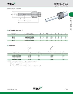 HSK40C Shank Tools HSK40C Shank Tools Hydraulic Chucks Slim Line (HC Slim HSK Form C continued) HC Slim MM-HSK Form C order number catalog number D1 D2 D21 L1 L2 L9 V kg 3061275 HSK40CHCSLT12150M 12 19,5 44,5 150,0 95 36 10 0,76 3061276 HSK40CHCSLT14150M 14 21,5 52,5 150,0 95 36 10 0,96 3061277 HSK40CHCSLT16150M 16 23,5 52,5 150,0 95 39 10 0,98 3061278 HSK40CHCSLT18150M 18 25,5 52,5 150,0 95 39 10 1,02 3061279 HSK40CHCSLT20150M 20 27,5 52,5 150,0 95 41 10 1,06 Spare Parts actuation wrench size length-adjustment wrench size catalog number wrench actuation screw wrench stop screw HSK40CHCSLT12150M 170.135 5mm 170.003 3mm HSK40CHCSLT14150M 170.135 5mm 170.003 3mm HSK40CHCSLT16150M 170.135 5mm 170.005 5mm HSK40CHCSLT18150M 170.135 5mm 170.005 5mm HSK40CHCSLT20150M 170.135 5mm 170.005 5mm NOTE: Do not overtorque actuation screw. Tighten by hand until stop is felt. Hydraulic chuck technical section, see page K60. Supplied with stop screw. Actuation wrenches must be ordered separately. Unable to use SEFAS™ chamfering rings on this design. Reduction sleeves are available and must be ordered separately; see page I2. WWW.WIDIA.COM B145