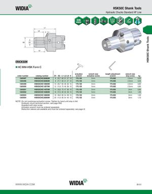 HSK50C Shank Tools HSK50C Shank Tools Hydraulic Chucks Standard HP Line HC MM-HSK Form C actuation wrench size length-adjustment wrench size order number catalog number D1 D2 L1 L2 L9 V wrench actuation screw wrench stop screw kg 1245497 HSK50CHC06060M 6 25,7 60 31 27 10 170.135 5mm 170.002 2,5mm 0,53 1245498 HSK50CHC08060M 8 27,7 60 31 27 10 170.135 5mm 170.002 2,5mm 0,55 1245499 HSK50CHC10065M 10 29,7 65 36 30 10 170.135 5mm 170.002 2,5mm 0,60 1245500 HSK50CHC12075M 12 31,6 75 46 36 10 170.135 5mm 170.002 2,5mm 0,80 1245501 HSK50CHC14075M 14 33,6 75 47 36 10 170.135 5mm 170.003 3mm 0,90 1245502 HSK50CHC16080M 16 37,6 80 53 39 10 170.135 5mm 170.003 3mm 1,00 1245503 HSK50CHC18080M 18 39,6 80 54 39 10 170.135 5mm 170.003 3mm 1,00 1245504 HSK50CHC20080M 20 41,6 80 54 40 10 170.135 5mm 170.003 3mm 1,10 NOTE: Do not overtorque actuation screw. Tighten by hand until stop is felt. Hydraulic chuck technical section, see page K60. Supplied with stop screw. Actuation wrench must be ordered separately. Reduction sleeves are available and must be ordered separately; see page I2. WWW.WIDIA.COM B151