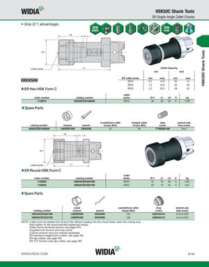 HSK50C Shank Tools HSK50C Shank Tools ER Single-Angle Collet Chucks • Grip (2:1 advantage). collet series Collet Capacity mm inch ER collet series min max min max ER16 0,5 10,0 .02 .41 ER25 1,0 16,0 .04 .63 ER Hex-HSK Form C ER32 2,0 20,0 .08 .81 collet order number catalog number series D11 L1 L9 V kg 1139074 HSK50CER16060M ER16 28 60 28 5 0,38 Spare Parts counterbore collet straight collet stop wrench size catalog number locknut wrench torque (Nm) torque (Nm) screw stop screw HSK50CER16060M LNHSER16M OEW25M 40 56 TTSS08014M 4mm collet series ER Round-HSK Form C collet order number catalog number series D11 L1 L9 V kg 1120659 HSK50CER25070M ER25 42 70 40 5 0,50 1126932 HSK50CER32075M ER32 50 75 45 5 0,67 Spare Parts round counterbore collet stop wrench size catalog number locknut wrench torque (Nm) screw stop screw HSK50CER25070M LNSER25M ER25WM 104 SS075041G 4mm & 5/32 HSK50CER32075M LNSER32M ER32WM 136 SS094041G 4mm & 5/32 NOTE: Collet must be loaded into locknut first. Before loading into the chuck body, insert the cutting tool, then tighten to the recommended tightening torque. Collet chuck technical section, see page K74. Supplied with locknut and stop screw. Locknut wrench must be ordered separately. ER standard straight-bore collets, see page I50. ER tap collets, see page I58. ER TCT tension-only tap collets, see page I60. WWW.WIDIA.COM B153