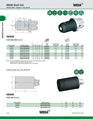 HSK50C Shank Tools HSK50C Shank Tools Whistle Notch™ Adapters • Bar Blanks WN MM-HSK Form C lock wrench size stop wrench size order number catalog number D1 D2 L1 L9 V screw lock screw Nm screw stop screw kg 1519772 HSK50CWN06060M 6 25 60 28 6 SS03M012 3mm 7 571.060 2,5mm 0,38 1519774 HSK50CWN08060M 8 28 60 28 6 SS03M014 4mm 15 571.067 3mm 0,42 1131275 HSK50CWN10065M 10 35 65 30 6 SS03M018 5mm 25 571.068 5mm 0,56 1131266 HSK50CWN12075M 12 42 75 38 8 SS03M023 6mm 35 571.074 5mm 0,80 1519777 HSK50CWN14075M 14 44 75 38 8 SS03M023 6mm 35 571.074 5mm 0,85 1519638 HSK50CWN16080M 16 48 80 41 10 SS03M025 6mm 50 571.075 6mm 1,03 1519639 HSK50CWN18080M 18 50 80 41 10 SS03M025 6mm 50 571.075 6mm 1,10 1519791 HSK50CWN20080M 20 52 80 39 8 SS03M026 8mm 95 571.076 6mm 1,15 NOTE: Do not overtighten clamp screw; use torque recommendations above. Supplied with clamp screw and stop screw. Clamp screw or stop screw wrenches are not included. • Machinable front 32–38 RW C. BB-HSK Form C order number catalog number D2 L1 kg 1519733 HSK50CBB053100M 53,8 100 1,77 1519745 HSK50CBB053200M 53,8 200 3,55 1519750 HSK50CBB083175M 83,8 175 7,23 B154 WWW.WIDIA.COM