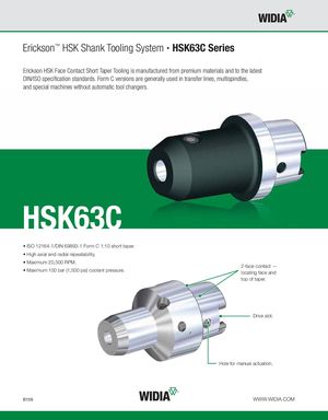 Erickson™ HSK Shank Tooling System • HSK63C Series Erickson HSK Face Contact Short Taper Tooling is manufactured from premium materials and to the latest DIN/ISO specification standards. Form C versions are generally used in transfer lines, multispindles, and special machines without automatic tool changers. HSK63C • ISO 12164-1/DIN 69893-1 Form C 1:10 short taper. • High axial and radial repeatability. • Maximum 20,500 RPM. 2-face contact — • Maximum 100 bar (1,500 psi) coolant pressure. locating face and top of taper. Drive slot. Hole for manual actuation. B156 WWW.WIDIA.COM