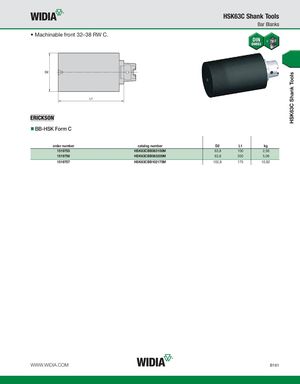 HSK63C Shank Tools HSK63C Shank Tools Bar Blanks • Machinable front 32–38 RW C. BB-HSK Form C order number catalog number D2 L1 kg 1519755 HSK63CBB063100M 63,8 100 2,56 1519756 HSK63CBB063200M 63,8 200 5,06 1519757 HSK63CBB102175M 102,8 175 10,92 WWW.WIDIA.COM B161