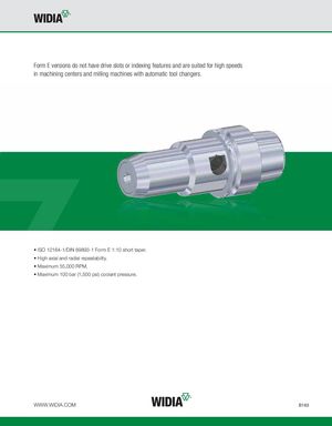 Form E versions do not have drive slots or indexing features and are suited for high speeds in machining centers and milling machines with automatic tool changers. • ISO 12164-1/DIN 69893-1 Form E 1:10 short taper. • High axial and radial repeatability. • Maximum 55,000 RPM. • Maximum 100 bar (1,500 psi) coolant pressure. WWW.WIDIA.COM B163