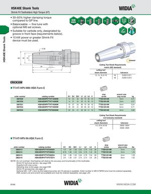 HSK40E Shank Tools HSK40E Shank Tools Shrink Fit Toolholders High Torque (HT) • 30–50% higher clamping torque compared to GP line. • Balanceable — fine tune with optional M6 set screws. • Suitable for carbide only, designated by groove in front face (requirements below). • 10 kW power or greater Shrink Fit device must be used. Cutting Tool Shank Requirements metric (ISO standard) cutting tool shank diameter tolerance 12, 14, 16, & 18 h6 0,000/-0,011 20 h6 0,000/-0,013 TT-HT-HPV-MM-HSK Form E stop wrench size order number catalog number D1 D2 D21 L1 L2 L9 V screw stop screw kg 3867229 HSK40EHPVTTHT12090M 12 24 32 90 70 36 10 TTSS10014M 5mm 0,51 3867230 HSK40EHPVTTHT14090M 14 27 34 90 70 36 10 TTSS10014M 5mm 0,57 3867231 HSK40EHPVTTHT16090M 16 27 34 90 70 39 10 TTSS12014M 6mm 0,54 3867232 HSK40EHPVTTHT18095M 18 33 41 95 95 39 10 TTSS12014M 6mm 0,71 3867233 HSK40EHPVTTHT20095M 20 33 41 95 95 41 10 TTSS16014M 8mm 0,68 Cutting Tool Shank Requirements inch (industry standard) cutting tool shank diameters tolerance 1/2, 9/16, & 5/8 .0000/-.0004 3/4 .0000/-.0005 TT-HT-HPV-IN-HSK Form E stop wrench size order number catalog number D1 D2 D21 L1 L2 L9 V screw stop screw lbs 3862413 HSK40EHPVTTHT050354 1/2 .94 1.26 3.54 2.76 1.42 .39 TTSS10014M 5mm 1.12 3862414 HSK40EHPVTTHT056354 9/16 1.06 1.33 3.54 2.76 1.42 .39 TTSS10014M 5mm 1.25 3862415 HSK40EHPVTTHT062354 5/8 1.06 1.33 3.54 2.76 1.54 .39 TTSS12014M 6mm 1.20 3862416 HSK40EHPVTTHT075374 3/4 1.30 1.61 3.74 3.74 1.61 .39 TTSS16014M 8mm 1.52 NOTE: Do not overheat. Overheating will destroy the accuracy and functionality of the toolholder. Shrink Fit technical section, see page K56. Supplied with stop screw. Adjusting stop screw gage, see page K59. Shrink Fit accessories, see page J2. Optional M6~1.0P x 5mm lg fine-balancing screw set (10 pieces) is available. Order number is MS1276PKG and must be ordered separately. HSK coolant unit and wrench are available and must be ordered separately; see page J32. B166 WWW.WIDIA.COM