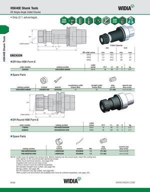 HSK40E Shank Tools HSK40E Shank Tools ER Single-Angle Collet Chucks • Grip (2:1 advantage). collet series Collet Capacity mm inch ER collet series min max min max ER16 0,5 10,0 .02 .41 ER25 1,0 16,0 .04 .63 ER32 2,0 20,0 .08 .81 ER Hex-HSK Form E collet order number catalog number series D11 L1 L9 V kg 2260355 HSK40EER16080M ER16 28 80 27 5 0,41 Spare Parts counterbore collet straight collet stop wrench size catalog number locknut wrench torque (Nm) torque (Nm) screw stop screw HSK40EER16080M LNHSER16M OEW25M 40 56 571.068 4mm & 5/32 collet series ER Round-HSK Form E collet order number catalog number series D11 L1 L9 V kg 1795995 HSK40EER25080M ER25 42 80 31 5 0,51 2386949 HSK40EER32100M ER32 50 100 40 5 0,71 Spare Parts round stop wrench size catalog number locknut wrench Nm screw stop screw HSK40EER25080M LNSER25M ER25WM 104 571.062 4mm & 5/32 HSK40EER32100M LNSER32M ER32WM 136 571.062 4mm & 5/32 NOTE: Collet must be loaded into locknut first. Before loading into the chuck body, insert the cutting tool, then tighten to the recommended tightening torque. Collet chuck technical section, see page K74. Supplied with locknut and stop screw. Locknut wrench must be ordered separately. ER standard straight-bore collets, see page I50. ER tap collets, see page I58. ER TCT tension-only tap collets, see page I60. HSK coolant unit and wrench are available and must be ordered separately; see page J32. B168 WWW.WIDIA.COM