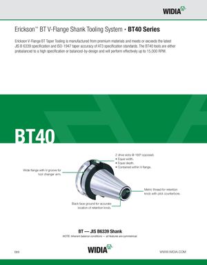 Erickson™ BT V-Flange Shank Tooling System • BT40 Series Erickson V-Flange BT Taper Tooling is manufactured from premium materials and meets or exceeds the latest JIS B 6339 specification and ISO-1947 taper accuracy of AT3 specification standards. The BT40 tools are either prebalanced to a high specification or balanced-by-design and will perform effectively up to 15,000 RPM. BT40 2 drive slots @ 180º opposed. • Equal width. • Equal depth. • Contained within V-flange. Wide flange with V-groove for tool changer arm. Metric thread for retention knob with pilot counterbore. Back face ground for accurate location of retention knob. BT — JIS B6339 Shank NOTE: Inherent balance conditions — all features are symmetrical. D20 WWW.WIDIA.COM