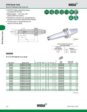 BT40 Shank Tools BT40 Shank Tools Shrink Fit Toolholders High Torque (HT) • 30–50% higher clamping torque compared to GP line. • Balanceable — fine tune with optional M6 set screws. • Suitable for carbide only, designated by groove in front face (requirements below). • 10 kW power or greater Shrink Fit device must be used. Cutting Tool Shank Requirements metric (ISO standard) cutting tool shank diameter tolerance 12, 14, 16, & 18 h6 0,000/-0,011 20 & 25 h6 0,000/-0,013 32 h6 0,000/-0,016 TT HT HPV MM-BT Form B/AD stop wrench size order number catalog number D1 D2 D21 D22 L1 L2 L21 L9 V screw stop screw kg 3615457 BT40BHPVTTHT12090M 12 24 32 — 90 63 — 36 10 TTSS10014M 5mm 1,20 3615458 BT40BHPVTTHT12120M 12 24 32 — 120 93 — 36 10 TTSS10014M 5mm 1,38 3615459 BT40BHPVTTHT12160M 12 24 32 37 160 63 133 36 10 TTSS10014M 5mm 1,70 3615460 BT40BHPVTTHT14090M 14 27 34 — 90 63 — 36 10 TTSS10014M 5mm 1,25 3615461 BT40BHPVTTHT14120M 14 27 34 — 120 93 — 36 10 TTSS10014M 5mm 1,45 3615462 BT40BHPVTTHT14160M 14 27 34 39 160 63 133 36 10 TTSS10014M 5mm 1,81 3615463 BT40BHPVTTHT16090M 16 27 34 — 90 63 — 39 10 TTSS12014M 6mm 1,23 3615464 BT40BHPVTTHT16120M 16 27 34 — 120 93 — 39 10 TTSS12014M 6mm 1,43 3615465 BT40BHPVTTHT16160M 16 27 34 39 160 63 133 39 10 TTSS12014M 6mm 1,77 3615466 BT40BHPVTTHT18090M 18 33 41 — 90 63 — 39 10 TTSS12014M 6mm 1,38 3615467 BT40BHPVTTHT18120M 18 33 42 — 120 93 — 39 10 TTSS12014M 6mm 1,69 3615468 BT40BHPVTTHT18160M 18 33 42 — 160 133 — 39 10 TTSS12014M 6mm 2,10 3615469 BT40BHPVTTHT20090M 20 33 41 — 90 63 — 41 10 TTSS16014M 8mm 1,35 3615470 BT40BHPVTTHT20120M 20 33 42 — 120 93 — 41 10 TTSS16014M 8mm 1,65 3615471 BT40BHPVTTHT20160M 20 33 42 — 160 133 — 41 10 TTSS16014M 8mm 2,06 3615472 BT40BHPVTTHT25100M 25 44 52 50 100 73 — 47 10 TTSS16014M 8mm 1,75 3615473 BT40BHPVTTHT32105M 32 44 53 50 105 78 — 51 10 TTSS16014M 8mm 1,66 (continued) D24 WWW.WIDIA.COM