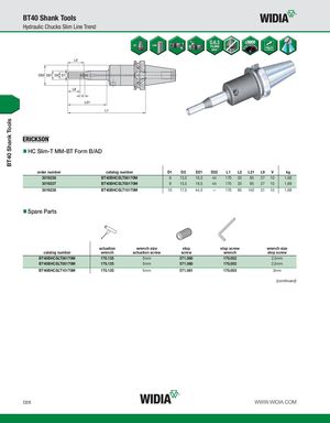 BT40 Shank Tools BT40 Shank Tools Hydraulic Chucks Slim Line Trend HC Slim-T MM-BT Form B/AD order number catalog number D1 D2 D21 D22 L1 L2 L21 L9 V kg 3019236 BT40BHCSLT06170M 6 13,5 19,5 44 170 35 85 27 10 1,68 3019237 BT40BHCSLT08170M 8 15,5 19,5 44 170 35 85 27 10 1,69 3019238 BT40BHCSLT10170M 10 17,5 44,5 — 170 85 145 31 10 1,68 Spare Parts actuation wrench size stop stop screw wrench size catalog number wrench actuation screw screw wrench stop screw BT40BHCSLT06170M 170.135 5mm 571.060 170.002 2,5mm BT40BHCSLT08170M 170.135 5mm 571.060 170.002 2,5mm BT40BHCSLT10170M 170.135 5mm 571.061 170.003 3mm (continued) D26 WWW.WIDIA.COM