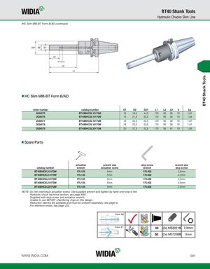 BT40 Shank Tools BT40 Shank Tools Hydraulic Chucks Slim Line (HC Slim MM-BT Form B/AD continued) HC Slim MM-BT Form B/AD order number catalog number D1 D2 D21 L1 L2 L9 V kg 2634575 BT40BHCSL12170M 12 19,5 44,5 170 95 36 10 1,61 2634576 BT40BHCSL14170M 14 21,5 52,5 170 95 36 10 1,84 2634577 BT40BHCSL16170M 16 23,5 52,5 170 95 39 10 1,87 2634578 BT40BHCSL18170M 18 25,5 52,5 170 95 39 10 1,91 2634579 BT40BHCSL20170M 20 27,5 52,5 170 95 41 10 1,95 Spare Parts actuation wrench size stop screw wrench size catalog number wrench actuation screw wrench stop screw BT40BHCSL12170M 170.135 5mm 170.002 2,5mm BT40BHCSL14170M 170.135 5mm 170.002 2,5mm BT40BHCSL16170M 170.135 5mm 170.002 2,5mm BT40BHCSL18170M 170.135 5mm 170.002 2,5mm BT40BHCSL20170M 170.135 5mm 170.002 2,5mm NOTE: Do not overtorque actuation screw. Use supplied wrench and tighten by hand until stop is felt. Hydraulic chuck technical section, see page K60. Supplied with stop screw and actuation wrench. Unable to use SEFAS™ chamfering rings on this design. Reduction sleeves are available and must be ordered separately; see page I2. For retention knobs, see page J33. WWW.WIDIA.COM D27
