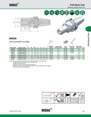 BT40 Shank Tools BT40 Shank Tools Hydraulic Chucks Trend Line HC Trend IN-BT Form B/AD actuation wrench size stop stop screw wrench size order number catalog number D1 D2 D21 L1 L2 L9 V wrench actuation screw screw wrench stop screw lbs 2263075 BT40BHCT025315 1/4 1.011 1.963 3.150 1.378 1.063 .394 170.135 5mm 571.061 170.003 3mm 2.85 2263076 BT40BHCT038335 3/8 1.168 1.963 3.347 1.496 1.221 .394 170.135 5mm 571.061 170.003 3mm 3.02 2263077 BT40BHCT050354 1/2 1.243 1.963 3.543 1.575 1.417 .394 170.135 5mm 571.061 170.003 3mm 3.16 2263078 BT40BHCT062354 5/8 1.479 1.963 3.543 1.831 1.535 .394 170.135 5mm 571.063 — 5mm 3.23 2263079 BT40BHCT075374 3/4 1.636 1.963 3.740 1.890 1.614 .394 170.135 5mm 571.063 — 5mm 3.49 2263080 BT40BHCT100453 1 1.959 2.474 4.528 2.008 1.850 .394 170.136 6mm 571.063 170.005 5mm 4.80 2263081 BT40BHCT125472 1 1/4 2.352 2.474 4.724 2.323 2.008 .394 170.136 6mm 571.063 170.005 5mm 5.43 NOTE: Do not overtorque actuation screw. Tighten by hand until stop is felt. Hydraulic chuck technical section, see page K60. Supplied with stop screw. Actuation wrench must be ordered separately. Reduction sleeves are available and must be ordered separately; see page I2. For retention knobs, see page J33. WWW.WIDIA.COM D29