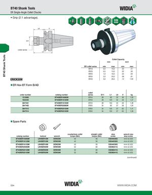 BT40 Shank Tools BT40 Shank Tools ER Single-Angle Collet Chucks • Grip (2:1 advantage). collet series Collet Capacity mm inch ER collet series min max min max ER16 0,5 10,0 .02 .41 ER20 0,5 13,0 .02 .50 ER25 1,0 16,0 .04 .63 ER32 2,0 20,0 .08 .81 ER40 3,0 26,0 .12 1.00 ER Hex-BT Form B/AD collet order number catalog number series D11 L1 L9 V kg 1315660 BT40BER16060M ER16 28 60 32 39 1,03 1623345 BT40BER16120M ER16 28 120 32 48 1,27 3847461 BT40BER16150M ER16 28 150 32 48 1,39 3847462 BT40BER20060M ER20 34 60 37 38 1,04 3847513 BT40BER20120M ER20 34 120 37 63 1,41 3847514 BT40BER20150M ER20 34 150 37 63 1,59 Spare Parts counterbore collet straight collet stop wrench size catalog number locknut wrench torque (Nm) torque (Nm) screw stop screw BT40BER16060M LNHSER16M OEW25M 40 56 SS044038G 4mm & 5/32 BT40BER16120M LNHSER16M OEW25M 40 56 SS044038G 4mm & 5/32 BT40BER16150M LNHSER16M OEW25M 40 56 SS044038G 4mm & 5/32 BT40BER20060M LNHSER20M OEW30M 32 80 SS056041G 4mm & 5/32 BT40BER20120M LNHSER20M OEW30M 32 80 SS056041G 4mm & 5/32 BT40BER20150M LNHSER20M OEW30M 32 80 SS056041G 4mm & 5/32 (continued) D34 WWW.WIDIA.COM