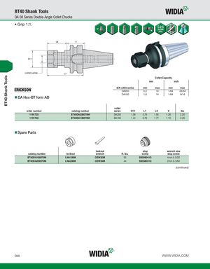 BT40 Shank Tools BT40 Shank Tools DA 08 Series Double-Angle Collet Chucks • Grip 1:1. collet series Collet Capacity mm inch DA collet series min max min max DA200 0,2 10 1/64 25/64 DA100 1,8 14 1/64 9/16 DA Hex-BT form AD collet order number catalog number series D11 L1 L9 V lbs 1191725 BT40DA208070M DA200 1.08 2.76 1.50 1.26 2.20 1191722 BT40DA108070M DA100 1.44 2.76 1.77 1.10 2.20 Spare Parts locknut stop wrench size catalog number locknut wrench ft. lbs. screw stop screw BT40DA108070M LNA108M OEW32M 55 SS056041G 4mm & 5/32 BT40DA208070M LNA208M OEW24M 44 SS038031G 2mm & 5/64 (continued) D36 WWW.WIDIA.COM