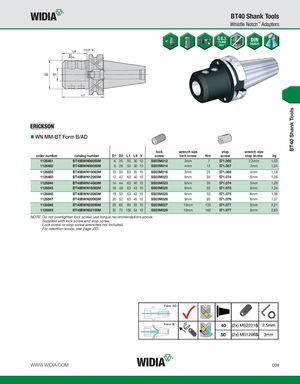 BT40 Shank Tools BT40 Shank Tools Whistle Notch™ Adapters WN MM-BT Form B/AD lock wrench size stop wrench size order number catalog number D1 D2 L1 L9 V screw lock screw Nm screw stop screw kg 1126481 BT40BWN06050M 6 25 50 30 10 SS03M012 3mm 7 571.060 2,5mm 1,03 1126482 BT40BWN08050M 8 28 50 30 10 SS03M014 4mm 15 571.067 3mm 1,04 1126850 BT40BWN10063M 10 35 63 35 10 SS03M018 5mm 25 571.068 4mm 1,18 1126483 BT40BWN12063M 12 42 63 40 10 SS03M023 6mm 35 571.074 5mm 1,26 1126844 BT40BWN14063M 14 44 63 40 10 SS03M023 6mm 35 571.074 5mm 1,28 1126845 BT40BWN16063M 16 48 63 43 10 SS03M025 6mm 50 571.075 6mm 1,34 1126846 BT40BWN18063M 18 50 63 43 10 SS03M025 6mm 50 571.075 6mm 1,36 1126847 BT40BWN20063M 20 52 63 45 10 SS03M026 8mm 95 571.076 6mm 1,37 1126848 BT40BWN25090M 25 65 90 55 10 SS03M027 10mm 135 571.077 6mm 2,21 1126849 BT40BWN32100M 32 72 100 54 10 SS03M029 10mm 160 571.077 6mm 2,63 NOTE: Do not overtighten lock screw; use torque recommendations above. Supplied with lock screw and stop screw. Lock screw or stop screw wrenches not included. For retention knobs, see page J33. WWW.WIDIA.COM D39