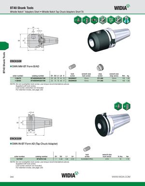 BT40 Shank Tools BT40 Shank Tools Whistle Notch™ Adapters Short • Whistle Notch Tap Chuck Adapters Short TA SWN MM-BT Form B/AD lock wrench size stop wrench size order number catalog number D1 D2 L1 L9 V screw lock screw screw stop screw Nm kg 1126479 BT40BSWN25075M 25 65 75 44 15 SS03M027 10mm 571.066 10mm 135 1,90 1126480 BT40BSWN32075M 32 72 75 46 17 SS03M029 10mm 571.066 10mm 160 1,98 NOTE: Do not overtighten lock screw; use torque recommendations above. Supplied with lock screw. Lock screw wrenches not included. For retention knobs, see page J33. SWN IN-BT Form AD (Tap Chuck Adapter) lock wrench size order number catalog number D1 D2 L1 L9 screw lock screw ft. lbs. lbs 1017937 BT40TA1106 1 2.48 1.06 2.50 ELS038031PKG 3/16 15 1.79 NOTE: Do not overtighten lock screw; use torque recommendations above. Supplied with lock screw. Lock screw wrench not included. For retention knobs, see page J33. D40 WWW.WIDIA.COM