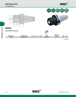 BT40 Shank Tools BT40 Shank Tools End Mill Adapters EM MM-BT Form AD lock wrench size order number catalog number D1 D2 L1 L9 screw lock screw Nm kg 1156359 BT40EM32110M 32 72 110 65 SS03M029 10mm 160 2,91 (continued) D42 WWW.WIDIA.COM