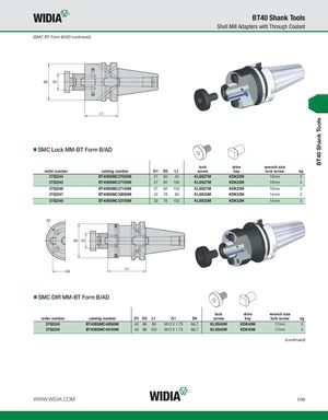 BT40 Shank Tools BT40 Shank Tools Shell Mill Adapters with Through Coolant (SMC BT Form B/AD continued) SMC Lock MM-BT Form B/AD lock drive wrench size order number catalog number D1 D2 L1 screw key lock screw kg 3752244 BT40BSMC27055M 27 60 55 KLSS27M KDK22M 10mm 2 3752245 BT40BSMC27100M 27 60 100 KLSS27M KDK22M 10mm 3 3752246 BT40BSMC27150M 27 60 150 KLSS27M KDK22M 10mm 4 3752247 BT40BSMC32060M 32 78 60 KLSS32M KDK32M 14mm 2 3752248 BT40BSMC32100M 32 78 100 KLSS32M KDK32M 14mm 3 SMC DIR MM-BT Form B/AD lock drive wrench size order number catalog number D1 D2 L1 G1 D4 screw key lock screw kg 3752249 BT40BSMC40060M 40 89 60 M12 X 1.75 66,7 KLSS40M KDK40M 17mm 3 3752250 BT40BSMC40100M 40 89 100 M12 X 1.75 66,7 KLSS40M KDK40M 17mm 4 (continued) WWW.WIDIA.COM D49