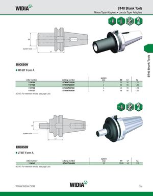 BT40 Shank Tools BT40 Shank Tools Morse Taper Adapters • Jacobs Taper Adapters system size MT-BT Form A system order number catalog number size D2 L1 kg 1156364 BT40MT1050M 1 25 50 1,01 1191735 BT40MT2050M 2 32 50 1,06 1191736 BT40MT3070M 3 40 70 1,13 1191737 BT40MT4095M 4 48 95 1,33 NOTE: For retention knobs; see page J33. system size JT-BT Form A system order number catalog number size D1 L1 kg 1156363 BT40JT33045M 33 15,85 45 1,12 NOTE: For retention knobs, see page J33. WWW.WIDIA.COM D55