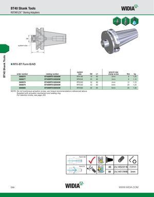 BT40 Shank Tools BT40 Shank Tools ROTAFLEX™ Boring Adapters system size RFX-BT Form B/AD system wrench size order number catalog number size D2 L1 clamp screw Nm kg 3860676 BT40BRFX185060M RFX185 19 60 3mm 8 1,00 3860677 BT40BRFX245060M RFX245 25 60 3mm 8 1,10 3860678 BT40BRFX320060M RFX320 32 60 4mm 12 1,10 3860679 BT40BRFX420060M RFX420 42 60 5mm 20 1,20 3860680 BT40BRFX550065M RFX550 55 65 6mm 25 1,30 NOTE: Do not overtorque actuation screw; use torque recommendations referenced above. Supplied with actuation mechanism and sealing ring. For retention knobs, see page J33. D56 WWW.WIDIA.COM