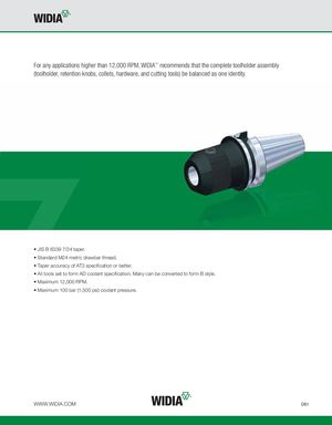 For any applications higher than 12,000 RPM, WIDIA™ recommends that the complete toolholder assembly (toolholder, retention knobs, collets, hardware, and cutting tools) be balanced as one identity. • JIS B 6339 7/24 taper. • Standard M24 metric drawbar thread. • Taper accuracy of AT3 specification or better. • All tools set to form AD coolant specification. Many can be converted to form B style. • Maximum 12,000 RPM. • Maximum 100 bar (1,500 psi) coolant pressure. WWW.WIDIA.COM D61