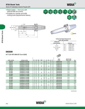 BT50 Shank Tools BT50 Shank Tools Shrink Fit Toolholders General Purpose (GP) • Balanceable — fine tune with optional M6 set screws. • Suitable for carbide and HSS cutting tools (requirements below). Cutting Tool Shank Requirements metric (ISO standard) cutting tool shank diameter tolerance 6 h6 0,000/-0,008 8 & 10 h6 0,000/-0,009 12, 14, 16, & 18 h6 0,000/-0,011 20 & 25 h6 0,000/-0,013 32 h6 0,000/-0,016 TT GP HPV MM-BT Form B/AD stop wrench size order number catalog number D1 D2 D21 D22 L1 L2 L21 L9 V screw stop screw kg 3782149 BT50BHPVTT06100M 6 21 27 — 100 62 — 26 10 TTSS05014M 2,5mm 3,69 3782150 BT50BHPVTT06160M 6 21 27 32 160 50 122 26 10 TTSS05014M 2,5mm 4,01 3782151 BT50BHPVTT08100M 8 21 27 — 100 62 — 26 10 TTSS06014M 3mm 3,68 3782152 BT50BHPVTT08160M 8 21 27 32 160 50 122 26 10 TTSS06014M 3mm 4,00 3782153 BT50BHPVTT10100M 10 24 32 — 100 62 — 31 10 TTSS08014M 4mm 3,75 3782154 BT50BHPVTT10160M 10 24 32 36 160 63 122 31 10 TTSS08014M 4mm 4,16 3615394 BT50BHPVTT12100M 12 24 32 — 100 63 — 36 10 TTSS10014M 5mm 3,73 3615395 BT50BHPVTT12160M 12 24 32 36 160 63 122 36 10 TTSS10014M 5mm 4,14 3615396 BT50BHPVTT14100M 14 27 34 — 100 62 — 36 10 TTSS10014M 5mm 3,78 3615397 BT50BHPVTT14160M 14 27 34 38 160 57 122 36 10 TTSS10014M 5mm 4,26 3615398 BT50BHPVTT16100M 16 27 34 — 100 62 — 39 10 TTSS12014M 6mm 3,75 3615399 BT50BHPVTT16160M 16 27 34 39 160 56 122 39 10 TTSS12014M 6mm 4,22 3615400 BT50BHPVTT18100M 18 33 41 — 100 62 — 39 10 TTSS12014M 6mm 3,90 3615401 BT50BHPVTT18160M 18 33 42 46 160 69 122 39 10 TTSS12014M 6mm 4,58 3615402 BT50BHPVTT20100M 20 33 41 — 100 62 — 41 10 TTSS16014M 8mm 3,87 3615403 BT50BHPVTT20160M 20 33 42 46 160 69 122 41 10 TTSS16014M 8mm 4,53 3615404 BT50BHPVTT25100M 25 44 52 — 100 62 — 47 10 TTSS16014M 8mm 4,15 3615405 BT50BHPVTT32100M 32 44 52 — 100 62 — 51 10 TTSS16014M 8mm 4,00 (continued) D62 WWW.WIDIA.COM
