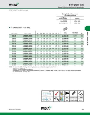 BT50 Shank Tools BT50 Shank Tools Shrink Fit Toolholders General Purpose (GP) (TT GP HPV BT Form B/AD continued) Cutting Tool Shank Requirements inch (industry standard) cutting tool shank diameters tolerance 1/4, 5/16, & 3/8 -.0001/-.0004 7/16, 1/2, & 5/8 .0000/-.0004 3/4, 7/8, 1, & 1-1/4 .0000/-.0005 TT GP HPV IN-BT Form B/AD stop wrench size order number catalog number D1 D2 D21 L1 L2 L21 L9 V screw stop screw lbs 3782155 BT50BHPVTT025394 1/4 .83 1.06 3.94 2.44 — 1.02 .39 TTSS05014M 2,5mm 8.14 3782156 BT50BHPVTT025787 1/4 .83 1.06 7.87 1.97 6.38 1.02 .39 TTSS05014M 2,5mm 9.42 3782157 BT50BHPVTT031394 5/16 .83 1.06 3.94 2.44 — 1.02 .39 TTSS06014M 3mm 8.12 3782158 BT50BHPVTT031787 5/16 .83 1.06 7.87 1.97 6.38 1.02 .39 TTSS06014M 3mm 9.41 3782159 BT50BHPVTT038394 3/8 .95 1.26 3.94 2.44 — 1.22 .39 TTSS08014M 4mm 8.26 3782160 BT50BHPVTT038787 3/8 .95 1.26 7.87 2.48 6.38 1.22 .39 TTSS08014M 4mm 9.92 3782161 BT50BHPVTT044394 7/16 .95 1.26 3.94 2.44 — 1.42 .39 TTSS10014M 5mm 8.24 3615382 BT50BHPVTT050394 1/2 .95 1.26 3.94 2.44 — 1.42 .39 TTSS10014M 5mm 8.21 3615383 BT50BHPVTT050787 1/2 .95 1.26 7.87 2.48 6.38 1.42 .39 TTSS10014M 5mm 9.87 3615384 BT50BHPVTT062394 5/8 1.06 1.34 3.94 2.44 — 1.54 .39 TTSS12014M 6mm 8.28 3615385 BT50BHPVTT062787 5/8 1.06 1.34 7.87 2.20 6.38 1.54 .39 TTSS12014M 6mm 10.14 3615386 BT50BHPVTT075394 3/4 1.30 1.61 3.94 2.44 — 1.61 .39 TTSS16014M 8mm 8.55 3615387 BT50BHPVTT075787 3/4 1.30 1.65 7.87 2.72 6.38 1.61 .39 TTSS16014M 8mm 11.17 3615388 BT50BHPVTT088394 7/8 1.30 1.61 3.94 2.44 — 1.61 .39 TTSS16014M 8mm 8.46 3615389 BT50BHPVTT088787 7/8 1.30 1.65 7.87 2.72 6.38 1.61 .39 TTSS16014M 8mm 11.08 3615390 BT50BHPVTT100394 1 1.73 2.05 3.94 2.44 — 1.85 .39 TTSS16014M 8mm 9.14 3615391 BT50BHPVTT100787 1 1.73 2.08 7.87 2.72 6.38 1.85 .39 TTSS16014M 8mm 13.21 3615392 BT50BHPVTT125394 1 1/4 1.73 2.05 3.94 2.44 — 2.01 .39 TTSS16014M 8mm 8.82 3615393 BT50BHPVTT125787 1 1/4 1.73 2.08 7.87 2.72 6.38 2.01 .39 TTSS16014M 8mm 12.88 NOTE: Do not overheat. Overheating will destroy the accuracy and functionality of the toolholder. Supplied with stop screw. Adjusting stop screw gage, see page K59. Optional M6~1.0P x 5mm lg fine-balancing screw set (10 pieces) is available. Order number is MS1276PKG and must be ordered separately. For retention knobs, see page J33. WWW.WIDIA.COM D63