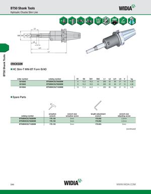BT50 Shank Tools BT50 Shank Tools Hydraulic Chucks Slim Line HC Slim-T MM-BT Form B/AD order number catalog number D1 D2 D21 D22 L1 L2 L21 L9 V kg 3019242 BT50BHCSLT06200M 6 13,5 19,5 44 200 35 85 27 10 4,55 3019243 BT50BHCSLT08200M 8 15,5 19,5 44 200 35 85 27 10 4,56 3019244 BT50BHCSLT10200M 10 17,5 44,5 — 200 85 162 31 10 4,55 Spare Parts actuation wrench size length-adjustment wrench size catalog number wrench actuation screw wrench adjusting screw BT50BHCSLT06200M 170.135 5mm 170.002 2,5mm BT50BHCSLT08200M 170.135 5mm 170.002 2,5mm BT50BHCSLT10200M 170.135 5mm 170.003 3mm (continued) D66 WWW.WIDIA.COM