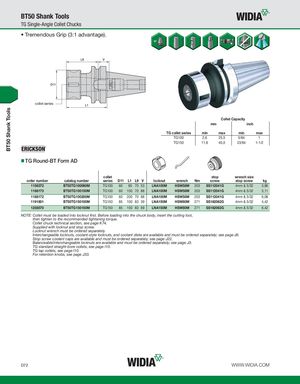BT50 Shank Tools BT50 Shank Tools TG Single-Angle Collet Chucks • Tremendous Grip (3:1 advantage). collet series Collet Capacity mm inch TG collet series min max min max TG100 2,6 25,5 5/64 1 TG150 11,6 40,0 23/64 1-1/2 TG Round-BT Form AD collet stop wrench size order number catalog number series D11 L1 L9 V locknut wrench Nm screw stop screw kg 1156372 BT50TG100090M TG100 60 90 70 53 LNA100M HSW58M 203 SS112041G 4mm & 5/32 3,96 1188173 BT50TG100150M TG100 60 150 70 88 LNA100M HSW58M 203 SS112041G 4mm & 5/32 5,11 1188172 BT50TG100200M TG100 60 200 70 88 LNA100M HSW58M 203 SS112041G 4mm & 5/32 6,08 1191801 BT50TG150100M TG150 85 100 83 39 LNA150M HSW80M 271 SS162062G 4mm & 5/32 4,42 1258570 BT50TG150150M TG150 85 150 83 69 LNA150M HSW80M 271 SS162062G 4mm & 5/32 6,42 NOTE: Collet must be loaded into locknut first. Before loading into the chuck body, insert the cutting tool, then tighten to the recommended tightening torque. Collet chuck technical section, see page K74. Supplied with locknut and stop screw. Locknut wrench must be ordered separately. Interchangeable locknuts, coolant-style locknuts, and coolant disks are available and must be ordered separately; see page J6. Stop screw coolant caps are available and must be ordered separately; see page J22. Balanceable/interchangeable locknuts are available and must be ordered separately; see page J3. TG standard straight-bore collets, see page I10. TG tap collets, see page I10. For retention knobs, see page J33. D72 WWW.WIDIA.COM