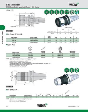 BT50 Shank Tools BT50 Shank Tools DA 08 Series Double-Angle Collet Chucks • Drill Chucks • Grip 1:1. collet series Collet Capacity mm inch DA collet series min max min max DA Round-BT form AD DA180 2,2 20 1/64 3/4 collet order number catalog number series D11 L1 L9 V kg 1258441 BT50DA188200M DA180 1.69 7.87 1.97 1.81 5,00 1197722 BT50DA188150M DA180 1.69 5.91 1.97 1.81 4,50 1191767 BT50DA188070M DA180 1.69 2.76 1.97 1.85 3,70 Spare Parts locknut stop wrench size catalog number locknut wrench Nm screw stop screw BT50DA188200M LNA188M HSW45M 136 SS081041G 4mm & 5/32 BT50DA188150M LNA188M HSW45M 136 SS081041G 4mm & 5/32 BT50DA188070M LNA188M HSW45M 136 SS081041G 4mm & 5/32 NOTE: Tighten locknut to the recommended tightening torque. Collet chuck technical section, see page K74. Supplied with locknut and stop screw. Locknut wrench must be ordered separately. Stop screw coolant caps are available and must be ordered separately; see page J22. DA standard straight-bore collets, see page I63. DA non-pullout collets, see page I65. For retention knobs, see page J33. DC-BT Form A D1 D1 max order number catalog number mm in mm in D2 L1 L1S wrench Nm kg 3583294 BT50DC13110M 1,0 .039 13,0 .512 51 122 110 PSW45M 55 4,44 NOTE: Tighten to the recommended tightening torque. Locking wrench not supplied. For retention knobs, see page J33. D76 WWW.WIDIA.COM