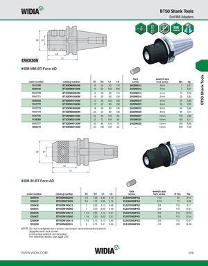 BT50 Shank Tools BT50 Shank Tools End Mill Adapters EM MM-BT Form AD lock wrench size order number catalog number D1 D2 L1 L9 screw lock screw Nm kg 1191769 BT50EM06063M 6 25 63 119 SS03M012 3mm 7 3,57 1258446 BT50EM06150M 6 25 150 206 SS03M012 3mm 7 3,87 1191770 BT50EM08063M 8 28 63 119 SS03M014 4mm 15 3,59 1191771 BT50EM10080M 10 35 80 136 SS03M018 5mm 25 3,82 1258453 BT50EM10100M 10 35 100 156 SS03M018 5mm 25 3,88 1191772 BT50EM12080M 12 42 80 136 SS03M023 6mm 35 3,85 1191773 BT50EM16080M 16 48 80 136 SS03M025 6mm 50 3,96 1191774 BT50EM20080M 20 52 80 136 SS03M026 8mm 95 4,01 1191776 BT50EM25105M 25 65 105 60 SS03M027 10mm 135 4,88 1156369 BT50EM32105M 32 72 105 65 SS03M029 10mm 160 5,11 1191777 BT50EM40120M 40 90 120 75 SS03M029 10mm 160 6,66 1258473 BT50EM50130M 50 100 130 85 — 12mm 200 7,60 EM IN-BT Form AD lock wrench size order number catalog number D1 D2 L1 L9 screw lock screw ft. lbs. lbs 1258444 BT50EM050295 1/2 1.38 2.95 5.16 ELS044038PKG 7/32 20 8.14 1258447 BT50EM075295 3/4 1.75 2.95 5.16 ELS062050PKG 5/16 70 8.36 1258450 BT50EM100413 1 2.00 4.13 4.49 ELS075056PKG 3/8 110 9.11 1258451 BT50EM100600 1 2.00 6.00 4.49 ELS075056PKG 3/8 110 10.51 1258456 BT50EM125413 1 1/4 2.50 4.13 2.51 ELS075062PKG 3/8 110 10.23 1258457 BT50EM125600 1 1/4 2.50 6.00 2.51 ELS075062PKG 3/8 110 12.54 1258459 BT50EM150413 1 1/2 2.75 4.13 2.93 ELS075062PKG 3/8 110 10.41 1232393 BT50EM200531 2 3.75 5.31 3.53 ELS100088PKG 1/2 150 16.00 NOTE: Do not overtighten lock screw; use torque recommendations above. Supplied with lock screw. Lock screw wrench not included. For retention knobs, see page J33. WWW.WIDIA.COM D79