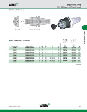 BT50 Shank Tools BT50 Shank Tools Shell Mill Adapters with Through Coolant (SMC BT Form B/AD continued) SMC Lock MM-BT Form B/AD lock drive order number catalog number D1 D2 D4 G1 L1 screw key kg 3750043 BT50BSMC27045M 27 60 — — 45 KLSS27M KDK27M 3,76 3750044 BT50BSMC27100M 27 60 — — 100 KLSS27M KDK27M 4,86 3750045 BT50BSMC27150M 27 60 — — 150 KLSS27M KDK27M 5,85 3750046 BT50BSMC32045M 32 78 — — 45 KLSS32M KDK32M 3,94 3750047 BT50BSMC32100M 32 78 — — 100 KLSS32M KDK32M 5,87 3750048 BT50BSMC32150M 32 78 — — 150 KLSS32M KDK32M 7,62 3750049 BT50BSMC40050M 40 89 66,7 M12 X 1.75 50 KLSS40M KDK40M 4,36 3750050 BT50BSMC40100M 40 89 66,7 M12 X 1.75 100 KLSS40M KDK40M 6,40 3750051 BT50BSMC40150M 40 89 66,7 M12 X 1.75 150 KLSS40M KDK40M 8,26 3750052 BT50BSMC60090M 60 129 101,6 M16 X 2.0 90 — KDK60M 8,53 (continued) WWW.WIDIA.COM D83