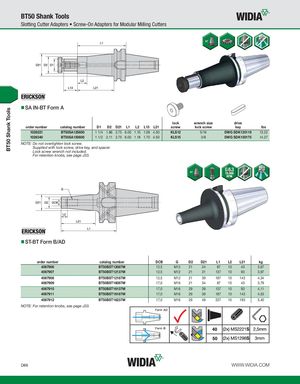 BT50 Shank Tools BT50 Shank Tools Slotting Cutter Adapters • Screw-On Adapters for Modular Milling Cutters SA IN-BT Form A lock wrench size drive order number catalog number D1 D2 D21 L1 L2 L13 L21 screw lock screw key lbs 1026221 BT50SA125600 1 1/4 1.86 2.75 6.00 1.10 1.09 4.50 KLS12 5/16 DWG SDK125119 13.22 1026340 BT50SA150600 1 1/2 2.11 2.75 6.00 1.18 1.70 4.50 KLS15 3/8 DWG SDK150175 14.27 NOTE: Do not overtighten lock screw. Supplied with lock screw, drive key, and spacer. Lock screw wrench not included. For retention knobs, see page J33. ST-BT Form B/AD order number catalog number DCB G D2 D21 L1 L2 L21 kg 4067906 BT50BST12087M 12,5 M12 21 24 87 10 43 3,67 4067907 BT50BST12137M 12,5 M12 21 31 137 10 93 3,97 4067908 BT50BST12187M 12,5 M12 21 39 187 10 143 4,34 4067909 BT50BST16087M 17,0 M16 21 34 87 10 43 3,79 4067910 BT50BST16137M 17,0 M16 29 39 137 10 93 4,11 4067911 BT50BST16187M 17,0 M16 29 39 187 10 143 4,53 4067912 BT50BST16237M 17,0 M16 29 49 237 10 193 5,40 NOTE: For retention knobs, see page J33. D86 WWW.WIDIA.COM