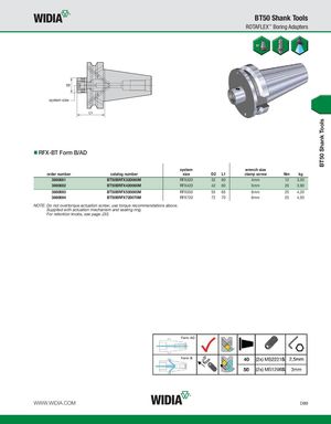 BT50 Shank Tools BT50 Shank Tools ROTAFLEX™ Boring Adapters system size RFX-BT Form B/AD system wrench size order number catalog number size D2 L1 clamp screw Nm kg 3860681 BT50BRFX320060M RFX320 32 60 4mm 12 3,50 3860682 BT50BRFX420060M RFX420 42 60 5mm 20 3,90 3860693 BT50BRFX550065M RFX550 55 65 6mm 25 4,20 3860694 BT50BRFX720070M RFX720 72 70 6mm 25 4,50 NOTE: Do not overtorque actuation screw; use torque recommendations above. Supplied with actuation mechanism and sealing ring. For retention knobs, see page J33. WWW.WIDIA.COM D89