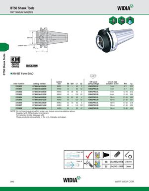 BT50 Shank Tools BT50 Shank Tools KM™ Modular Adapters system size KM-BT Form B/AD system KM spare wrench size order number catalog number size D2 D21 L1 L2 parts package actuation screw Nm kg 3783950 BT50BKM32040M KM32 32 — 40 2 KM32PKG3L 5mm 8-11 3,50 3783951 BT50BKM32090M KM32 32 — 90 52 KM32PKG3S 5mm 8-11 3,74 3783952 BT50BKM40060M KM40 40 48 60 4 KM40PKG3L 6mm 12-16 3,72 3783953 BT50BKM40100M KM40 40 — 100 62 KM40PKG3S 6mm 12-16 3,98 3783954 BT50BKM50060M KM50 50 63 60 4 KM50PKG3L 10mm 27-34 3,80 3783955 BT50BKM50120M KM50 50 — 120 82 KM50PKG3S 10mm 27-34 4,51 3783956 BT50BKM63060M KM63 63 70 60 5 KM63PKG3L 12mm 47-54 3,78 3783957 BT50BKM63140M KM63 63 — 140 102 KM63PKG3S 12mm 47-54 5,50 3783958 BT50BKM80080M KM80 80 — 80 42 KM80PKG3S 14mm 79-85 4,50 NOTE: Do not overtorque actuation screw; use torque recommendations above. Supplied with KM actuation mechanism. For retention knobs, see page J33. These products only available in the U.S., Canada, and Japan. D90 WWW.WIDIA.COM