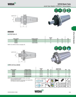 CAT40 Shank Tools CAT40 Shank Tools Jacobs Taper Adapters • ROTAFLEX™ Boring Adapters system size JT-CV Form A system order number catalog number size D1 L1 lbs 1025951 CV40JT2244 2 .56 1.57 2.33 1025953 CV40JT3278 3 .81 1.56 2.45 1025952 CV40JT33256 33 .62 1.56 2.32 NOTE: For retention knobs, see page J33. system size RFX-CV Form B/AD system wrench size order number catalog number size D2 L1 clamp screw Nm kg 3860896 CV40BRFX185236 RFX185 18,5 60 3mm 6 1,10 3860897 CV40BRFX245236 RFX245 24,5 60 3mm 8 1,10 3860898 CV40BRFX320236 RFX320 32,0 60 4mm 14 1,10 3860899 CV40BRFX420236 RFX420 42,0 60 5mm 16 1,10 3860900 CV40BRFX550256 RFX550 55,0 65 6mm 20 1,20 NOTE: Do not overtorque actuation screw; use torque recommendations above. Supplied with actuation mechanism and sealing ring. For retention knobs, see page J33. WWW.WIDIA.COM E35