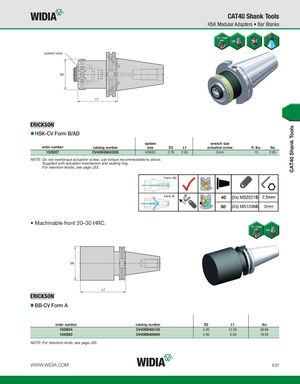 CAT40 Shank Tools CAT40 Shank Tools HSK Modular Adapters • Bar Blanks system size HSK-CV Form B/AD system wrench size order number catalog number size D2 L1 actuation screw ft. lbs. lbs 1533057 CV40BHSK63295 HSK63 2.76 2.95 5mm 15 2.65 NOTE: Do not overtorque actuation screw; use torque recommendations above. Supplied with actuation mechanism and sealing ring. For retention knobs, see page J33. • Machinable front 20–30 HRC. BB-CV Form A order number catalog number D2 L1 lbs 1020634 CV40BB400120 4.00 12.00 39.89 1020563 CV40BB400600 4.00 6.00 18.55 NOTE: For retention knob, see page J33. WWW.WIDIA.COM E37