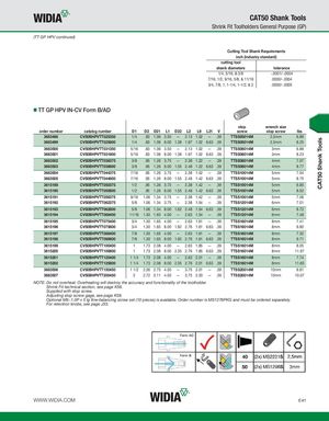 CAT50 Shank Tools CAT50 Shank Tools Shrink Fit Toolholders General Purpose (GP) (TT GP HPV continued) Cutting Tool Shank Requirements inch (industry standard) cutting tool shank diameters tolerance 1/4, 5/16, & 3/8 -.0001/-.0004 7/16, 1/2, 9/16, 5/8, & 11/16 .0000/-.0004 3/4, 7/8, 1, 1-1/4, 1-1/2, & 2 .0000/-.0005 TT GP HPV IN-CV Form B/AD stop wrench size order number catalog number D1 D2 D21 L1 D22 L2 L9 L21 V screw stop screw lbs 3683498 CV50BHPVTT025350 1/4 .83 1.06 3.50 — 2.13 1.02 — .39 TTSS05014M 2,5mm 6.89 3683499 CV50BHPVTT025800 1/4 .83 1.06 8.00 1.38 1.97 1.02 6.63 .39 TTSS05014M 2,5mm 8.25 3683500 CV50BHPVTT031350 5/16 .83 1.06 3.50 — 2.13 1.02 — .39 TTSS06014M 3mm 6.88 3683501 CV50BHPVTT031800 5/16 .83 1.06 8.00 1.38 1.97 1.02 6.63 .39 TTSS06014M 3mm 8.23 3683502 CV50BHPVTT038375 3/8 .95 1.26 3.75 — 2.38 1.22 — .39 TTSS08014M 4mm 7.07 3683503 CV50BHPVTT038800 3/8 .95 1.26 8.00 1.55 2.48 1.22 6.63 .39 TTSS08014M 4mm 8.77 3683504 CV50BHPVTT044375 7/16 .95 1.26 3.75 — 2.38 1.42 — .39 TTSS10014M 5mm 7.04 3683505 CV50BHPVTT044800 7/16 .95 1.26 8.00 1.55 2.48 1.42 6.63 .39 TTSS10014M 5mm 8.75 3615189 CV50BHPVTT050375 1/2 .95 1.26 3.75 — 2.38 1.42 — .39 TTSS10014M 5mm 6.95 3615190 CV50BHPVTT050800 1/2 .95 1.26 8.00 1.55 2.48 1.42 6.63 .39 TTSS10014M 5mm 8.52 3615191 CV50BHPVTT056375 9/16 1.06 1.34 3.75 — 2.38 1.42 — .39 TTSS10014M 5mm 7.06 3615192 CV50BHPVTT062375 5/8 1.06 1.34 3.75 — 2.38 1.54 — .39 TTSS12014M 6mm 7.01 3615193 CV50BHPVTT062800 5/8 1.06 1.34 8.00 1.62 2.48 1.54 6.63 .39 TTSS12014M 6mm 8.72 3615194 CV50BHPVTT068400 11/16 1.30 1.65 4.00 — 2.63 1.54 — .39 TTSS12014M 6mm 7.48 3615195 CV50BHPVTT075400 3/4 1.30 1.65 4.00 — 2.63 1.61 — .39 TTSS16014M 8mm 7.41 3615196 CV50BHPVTT075800 3/4 1.30 1.65 8.00 1.92 2.76 1.61 6.63 .39 TTSS16014M 8mm 9.80 3615197 CV50BHPVTT088400 7/8 1.30 1.65 4.00 — 2.63 1.61 — .39 TTSS16014M 8mm 7.32 3615198 CV50BHPVTT088800 7/8 1.30 1.65 8.00 1.92 2.76 1.61 6.63 .39 TTSS16014M 8mm 9.71 3615199 CV50BHPVTT100400 1 1.73 2.08 4.00 — 2.63 1.85 — .39 TTSS16014M 8mm 8.05 3615200 CV50BHPVTT100800 1 1.73 2.08 8.00 2.35 2.76 1.85 6.63 .39 TTSS16014M 8mm 11.97 3615201 CV50BHPVTT125400 1 1/4 1.73 2.08 4.00 — 2.63 2.01 — .39 TTSS16014M 8mm 7.74 3615202 CV50BHPVTT125800 1 1/4 1.73 2.08 8.00 2.35 2.76 2.01 6.63 .39 TTSS16014M 8mm 11.65 3683506 CV50BHPVTT150450 1 1/2 2.36 2.75 4.50 — 3.75 2.01 — .39 TTSS20014M 10mm 9.81 3683507 CV50BHPVTT200450 2 2.72 3.11 4.50 — 3.75 2.20 — .39 TTSS20014M 10mm 10.07 NOTE: Do not overheat. Overheating will destroy the accuracy and functionality of the toolholder. Shrink Fit technical section, see page K56. Supplied with stop screw. Adjusting stop screw gage, see page K59. Optional M6~1.0P x 5 lg fine-balancing screw set (10 pieces) is available. Order number is MS1276PKG and must be ordered separately. For retention knobs, see page J33. WWW.WIDIA.COM E41