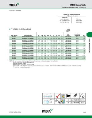 CAT50 Shank Tools CAT50 Shank Tools Shrink Fit Toolholders High Torque (HT) (TT HT HPV continued) Cutting Tool Shank Requirements inch (industry standard) cutting tool shank diameters tolerance 1/2, 9/16, 5/8 & 11/16 .0000/-.0004 3/4, 7/8, 1 & 1-1/4 .0000/-.0005 TT HT HPV IN-CV Form B/AD stop wrench size order number catalog number D1 D2 D21 D22 L1 L2 L9 L21 V screw stop screw lbs 3618016 CV50BHPVTTHT050375 1/2 .95 1.26 — 3.75 2.38 1.42 — .39 TTSS10014M 5mm 6.95 3618017 CV50BHPVTTHT050800 1/2 .95 1.26 1.55 8.00 2.48 1.42 6.63 .39 TTSS10014M 5mm 8.52 3618018 CV50BHPVTTHT056375 9/16 1.06 1.34 — 3.75 2.38 1.42 — .39 TTSS10014M 5mm 7.06 3618019 CV50BHPVTTHT062375 5/8 1.06 1.34 — 3.75 2.38 1.54 — .39 TTSS12014M 6mm 7.01 3618020 CV50BHPVTTHT062800 5/8 1.06 1.34 1.62 8.00 2.48 1.54 6.63 .39 TTSS12014M 6mm 8.72 3618021 CV50BHPVTTHT068400 11/16 1.30 1.65 — 4.00 2.63 1.54 — .39 TTSS12014M 6mm 7.48 3618022 CV50BHPVTTHT075400 3/4 1.30 1.65 — 4.00 2.63 1.61 — .39 TTSS16014M 8mm 7.41 3618023 CV50BHPVTTHT075800 3/4 1.30 1.65 1.92 8.00 2.76 1.61 6.63 .39 TTSS16014M 8mm 9.80 3618024 CV50BHPVTTHT088400 7/8 1.30 1.65 — 4.00 2.63 1.61 — .39 TTSS16014M 8mm 7.32 3618025 CV50BHPVTTHT088800 7/8 1.30 1.65 1.92 8.00 2.76 1.61 6.63 .39 TTSS16014M 8mm 9.72 3618026 CV50BHPVTTHT100400 1 1.73 2.08 — 4.00 2.63 1.85 — .39 TTSS16014M 8mm 8.05 3618027 CV50BHPVTTHT100800 1 1.73 2.08 2.35 8.00 2.76 1.85 6.63 .39 TTSS16014M 8mm 11.97 3618028 CV50BHPVTTHT125400 1 1/4 1.73 2.08 — 4.00 2.63 2.01 — .39 TTSS16014M 8mm 7.74 3618029 CV50BHPVTTHT125800 1 1/4 1.73 2.08 2.35 8.00 2.76 2.01 6.63 .39 TTSS16014M 8mm 11.65 NOTE: Do not overheat. Overheating will destroy the accuracy and functionality of the toolholder. Shrink Fit technical section, see page K56. Supplied with stop screw. Adjusting stop screw gage, see page K59. Optional M6~1.0P x 5 lg fine-balancing screw set (10 pieces) is available. Order number is MS1276PKG and must be ordered separately. For retention knobs, see page J33. WWW.WIDIA.COM E43